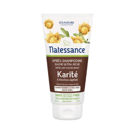 L'après-shampoing baume ultra-riche karité et kératine végétale 150ml Natessance est un soin capillaire pour nourrir les cheveux secs à très secs, crépus, frisés ou défrisés. L'association de karité et de kératine va nourrir, fortifier et apporter de la brillance à la chevelure. La formule, conditionnée dans un tube végétal, est sans silicone et sans sulfate.