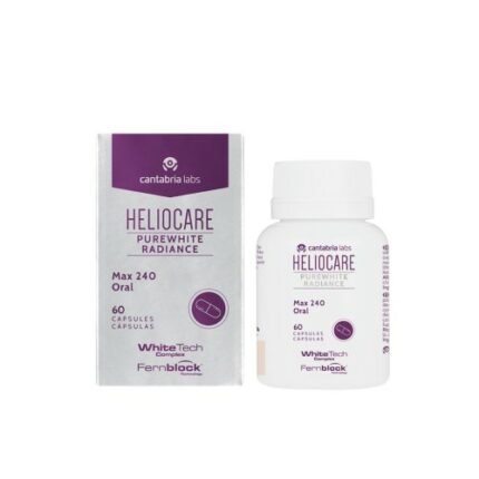 HELIOCARE Purewhite Radiance Max 240 offre une double protection : un antioxydant puissant à base de Fernblock® 240 mg et un WhiteTech Complex (grenade, L‑Cystine, vitamine C & B3) pour un teint uniforme et lumineux. La formule renforce la protection UV, limite le photovieillissement et réduit les taches pigmentaires en synergie avec une routine solaire topique. Facile à intégrer, 2 capsules/jour matin et soir, pour une peau visiblement unifiée, lumineuse et protégée. Testé dermatologiquement, ophtalmologiquement et hypoallergénique.