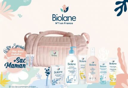 Sac souple vert contenant 6 produits Biolane en formats adaptés :