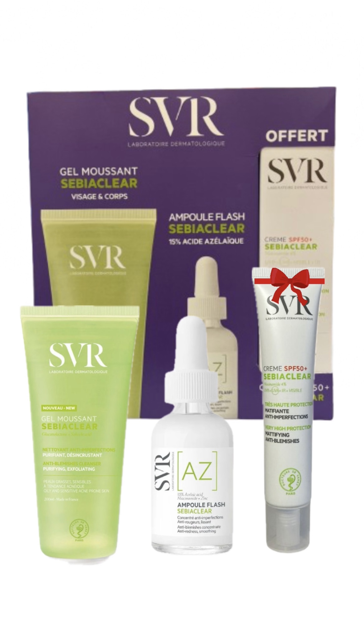 Coffret SVR Sebiaclear – Gel Moussant + Ampoule Flash AZ + Crème SPF50+ OFFERTE | Anti-Acné Peau Grasse