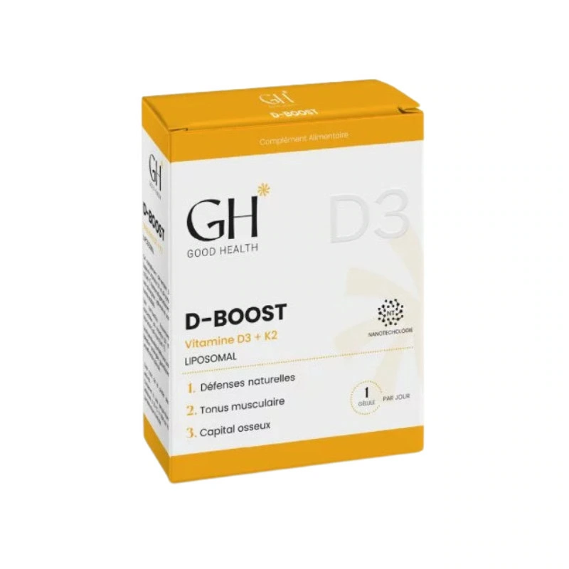 GOOD HEALTH D-Boost est un complément alimentaire associant deux vitamines essentielles : Vitamine D3 et Vitamine K2, pour un soutien optimal de la santé osseuse, du système immunitaire et de la circulation sanguine.