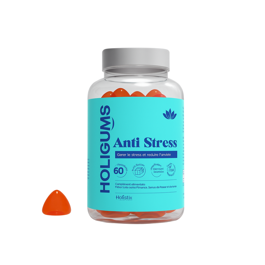 Holigums Anti-Stress est un complément alimentaire sous forme de gommes sans sucre, formulé pour aider à gérer le stress, l’anxiété légère et les tensions nerveuses. Il associe des extraits de plantes apaisantes, du magnésium et des vitamines B, reconnus pour leur action bénéfique sur le système nerveux.