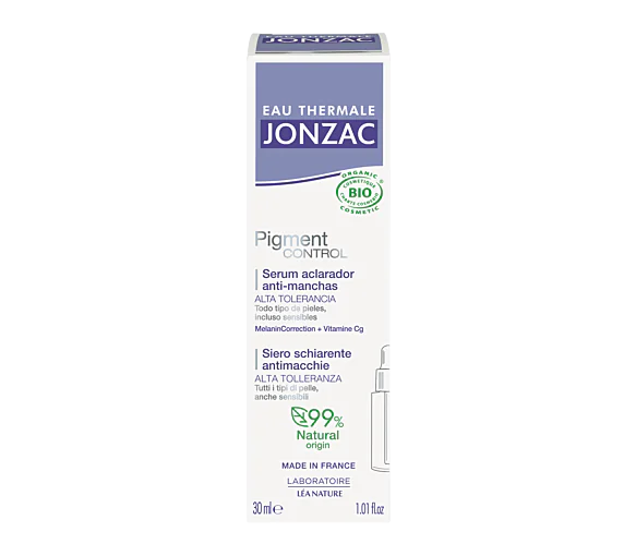 Le Sérum Éclaircissant Anti-Taches Pigment Control d’Eau Thermale Jonzac est un soin bio de 30 ml conçu pour tous les types de peau.
