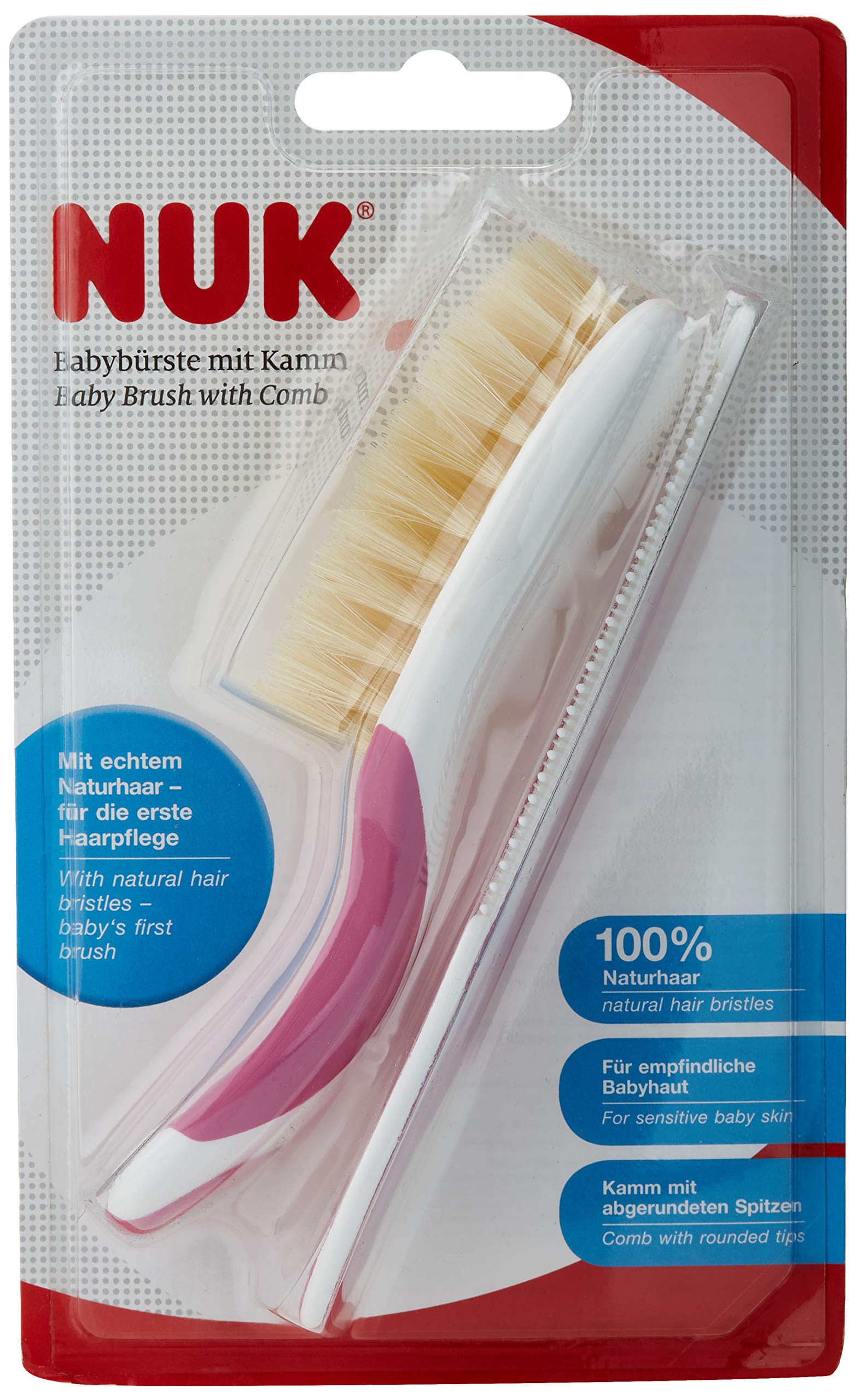 NUK baby brush made of 100% natural hair with comb with rounded tips 1 piece pink Rosa Single