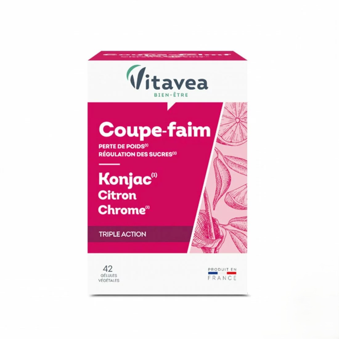VITAVEA COUPE-FAIM est un complément alimentaire formulé pour contribuer au contrôle du poids en réduisant la sensation de faim. Il aide à limiter les envies de grignotage et favorise un apport énergétique maîtrisé. Ce produit s’inscrit dans le cadre d’une démarche globale de contrôle du poids.